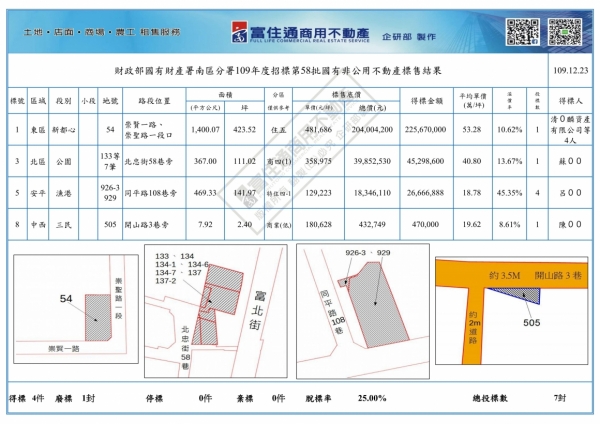 財政部國有財產署南區分署110年度招標第7批國有非公用不動產標售結果