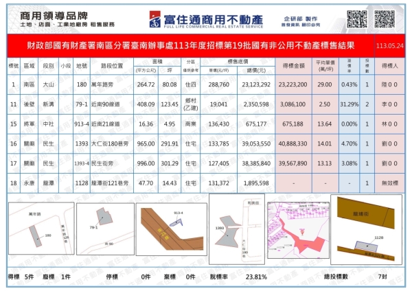 【臺南】財政部國有財產署南區分署臺南辦事處113年度招標第29批國有非公用不動產標售結果