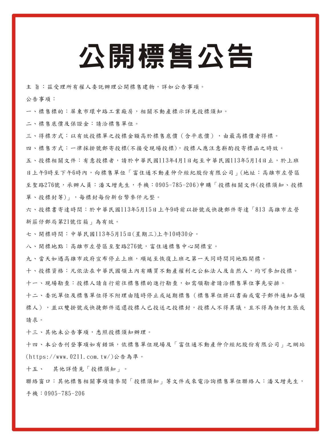 財政部國有財產署南區分署113年度招標第18批國有非公用不動產標售結果
