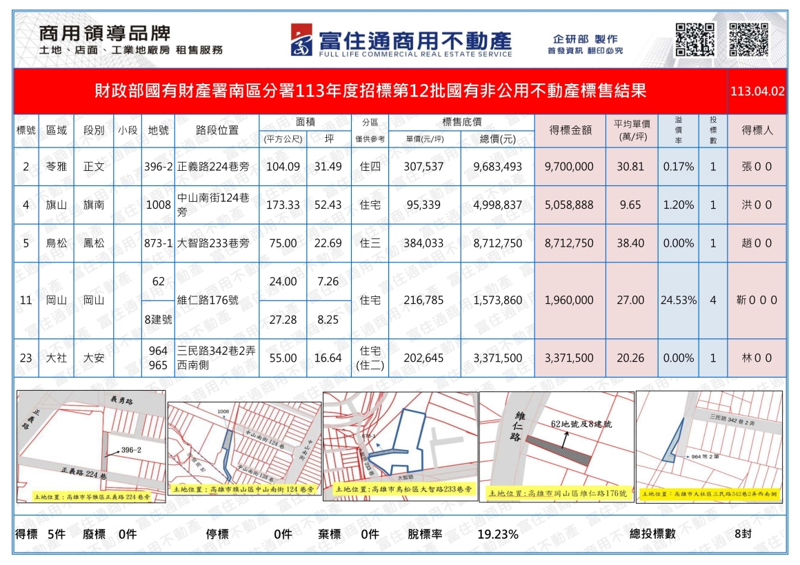 財政部國有財產署南區分署113年度招標第12批國有非公用不動產標售結果