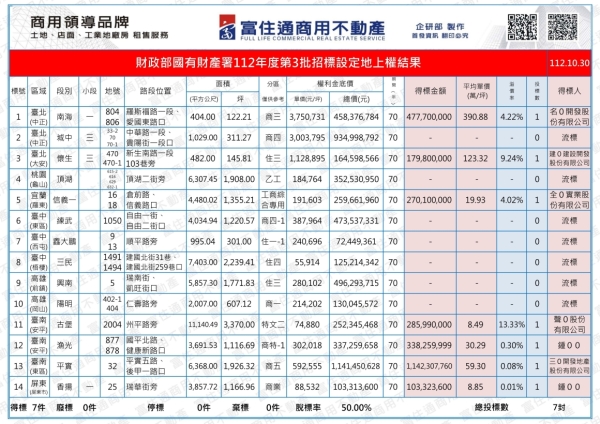 財政部國有財產署112年度第3批招標設定地上權結果